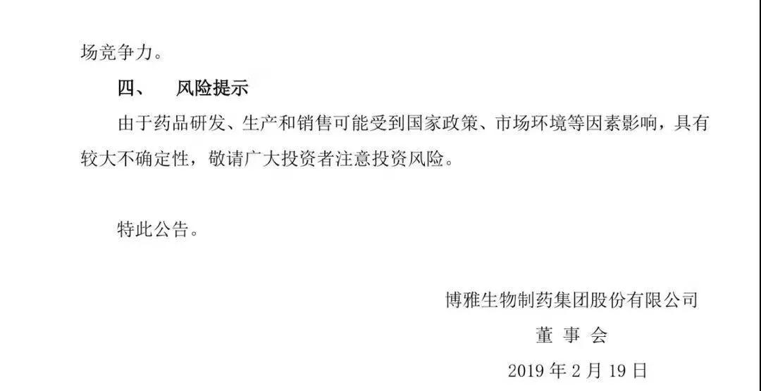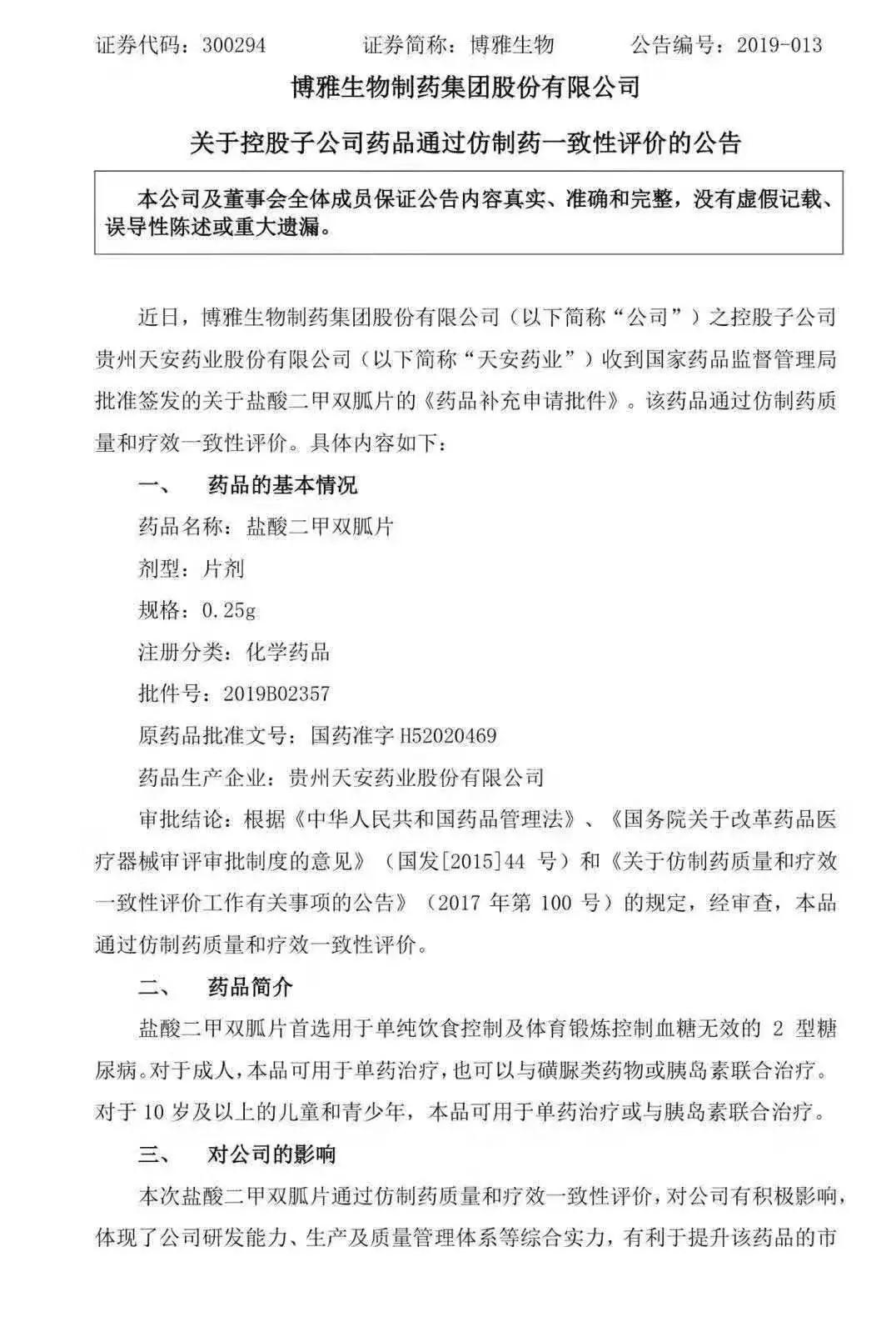2019年2月19日,,, ,,,博雅生物制药集团股份有限公司通告其控股子公司贵州天安药业股份有限公司(以下简称“天安药业”)收到国家药品监视管理局批准签发的关于盐酸二甲双胍片的《药品增补申请批件》 。 。。。。。。该药品通过仿制药质量和疗效一致性评价 。 。。。。。。