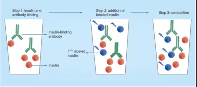 ͼ 2. Yalow×î³õ·¢Ã÷µÄÒȵºËØ·ÅÉäÃâÒ߲ⶨµÄÔÀíͼ¡£¡£¡£¡£¡£¡£¡£Ñù±¾ÖеÄÒȵºËØÔÚÈÜÒºÖÐÓ뿹ÒȵºËØÑªÇåÍŽᣨ°ì·¨1£©£¬£¬£¬£¬£¬£¬È»ºó°ÑÒÑ֪Ũ¶ÈµÄI131±ê¼ÇµÄÅ£ÒȵºËØÌí¼Óµ½·´Ó¦ÈÜÒºÖУ¨°ì·¨2£©£¬£¬£¬£¬£¬£¬Ñù±¾ÖеÄÒȵºËØÓëI131±ê¼ÇµÄÅ£ÒȵºËØ£¨°ì·¨3£©Ï໥¾ºÕùÓ뿹ÌåµÄÍŽᡣ¡£¡£¡£¡£¡£¡£Ê¹ÓÃÈËÒȵºËØÖƱ¸µÄ±ê×¼ÇúÏßÒÔ¼°ÒȵºËØ¿¹ÌåÍŽáµÄI131±ê¼ÇÅ£ÒȵºËصÄŨ¶È¿ÉÒÔÅÌËãÑù±¾Öб»Öû»µÄÒȵºËصÄŨ¶È¡£¡£¡£¡£¡£¡£¡£