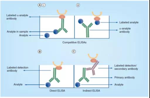 ͼ3. ¾ºÕùʽ£¨Ai & Aii£©¡¢Ö±½Ó£¨B£©ºÍ¼ä½Ó£¨C£©ELISA²âÊÔÃûÌõÄÔÀíͼ¡£¡£¡£¡£¡£¡£¡£Ä¿µÄÆÊÎöÎAnalyte£©´ú±í±»²â¶¨µÄÄ¿µÄÂѰ×ÖÊ¡£¡£¡£¡£¡£¡£¡£ÔÚ¾ºÕùʽELISAÖУ¬£¬£¬£¬£¬£¬¿ÉÒÔ±ê¼ÇÄ¿µÄÆÊÎöÎï»ò¿¹Ì壬£¬£¬£¬£¬£¬¶øÔÚÖ±½Ó»ò¼ä½ÓELISAÃûÌÃÖУ¬£¬£¬£¬£¬£¬Ö»±ê¼Ç¼ì²â¿¹Ìå¡£¡£¡£¡£¡£¡£¡£