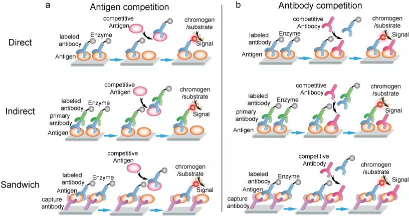ÉÏÊöÃûÌÃÊÇELISAµÄ»ù±¾Éè¼Æ£¬£¬£¬£¬£¬£¬ËùÖøÃûÌö¼¿ÉÒÔʹÓþºÕù»òÒÖÖÆÌõ¼þ¼ÓÒÔµ÷½â£¬£¬£¬£¬£¬£¬À´²â¶¨¿¹Ô»ò¿¹Ì壨ͼ5£©£¬£¬£¬£¬£¬£¬ËùÓÐÒªÁì¶¼ÒªÇóÓëÊÔ¼ÁÔ¤ÏÈ·´Ó¦/·õÓý²Å»ªµÖ´ï×î¼Ñ״̬¡£¡£¡£¡£¡£¡£¡£ÕâЩ×î¼Ñ״̬¿ÉÒÔͨ¹ýÌí¼Ó¿¹Ô£¨Í¼5a£©»ò¿¹Ì壨ͼ5b£©À´¸øÓèÌôÕ½¡£¡£¡£¡£¡£¡£¡£Ëæ×ÅÈÜÒºÖÐÓÎÀëµÄ¿¹Ô£¨¿¹Ì壩µÄÔöÌí£¬£¬£¬£¬£¬£¬Äܹ»ÓëÀο¿µ×Îimmobilized substrate£©ÍŽáµÄ¿¹Ì壨¿¹Ô£©µÄÊýÄ¿ÔòïÔÌ¡£¡£¡£¡£¡£¡£¡£Ï´µÓ°ì·¨ºó£¬£¬£¬£¬£¬£¬Ìí¼ÓÉúÉ«¼Áµ×Îchromophore substrate£©ÒÔ±¬·¢Ðźţ¨ÑÕɫת±ä»ò·¢¹â£©¡£¡£¡£¡£¡£¡£¡£¿£¿£¿£¿£¿¹Ìå/¿¹ÔÌôÕ½ÒýÆðµÄÐźÅת±äÕ¹ÏÖÁËÓйؾºÕùÐÔ¿¹Ô/¿¹ÌåµÄÐÅÏ¢¡£¡£¡£¡£¡£¡£¡£¾ºÕùʽELISA¹ØÓÚ²â¶¨ÖØ´ó»ìÏýÎïÖеĿ¹ÔŨ¶ÈÏ൱ÓÐÓ㬣¬£¬£¬£¬£¬ÌØÊâÊÇÔÚ¿ÉÄܺ¬Óп¹ÔµÄδ֪ÑùÆ·Ó뺬ÓÐÒÑÖªÊýÄ¿µÄ´¿»¯¿¹ÔµÄÀàËÆÑùƷʱ¡£¡£¡£¡£¡£¡£¡£