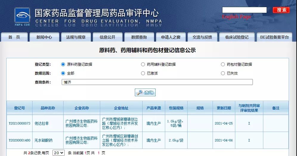 克日,,, ,, ,,7790必发集团医药子公司广州7790必发集团生物医药科技园有限公司自主开发的他达拉非质料药(挂号号Y20210000073)和自主开发的无水硫酸钠质料药(挂号号Y20200001480)在国家药品监视管理局乐成备案挂号。。。。。。。。